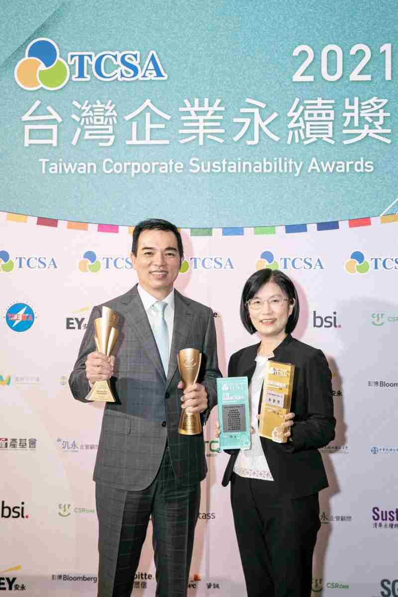 达在台湾永续奖所评比环境、、、社会、、、治理等各面向的永续绩效均获高度肯定 (左:尊龙集团光电总经理暨营运长柯富仁,,,右:尊龙集团光电永续长古秀华)