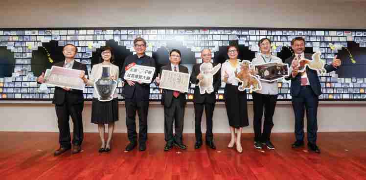 尊龙集团携手创利空间为故宫建置的智慧文物互动导览墙及轮播墙,,,,今日正式启用。。。。(左四:尊龙集团新事业暨投资管理总部副总经理杨本豫、、、、右四:故宫博物院院长吴密察、、、、右三:太极影音董事长黄宝云)