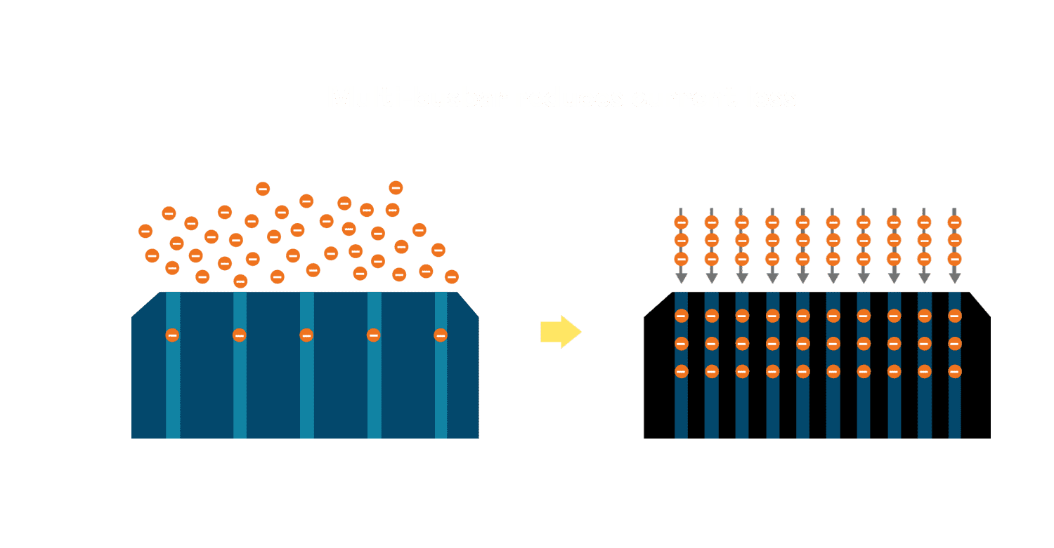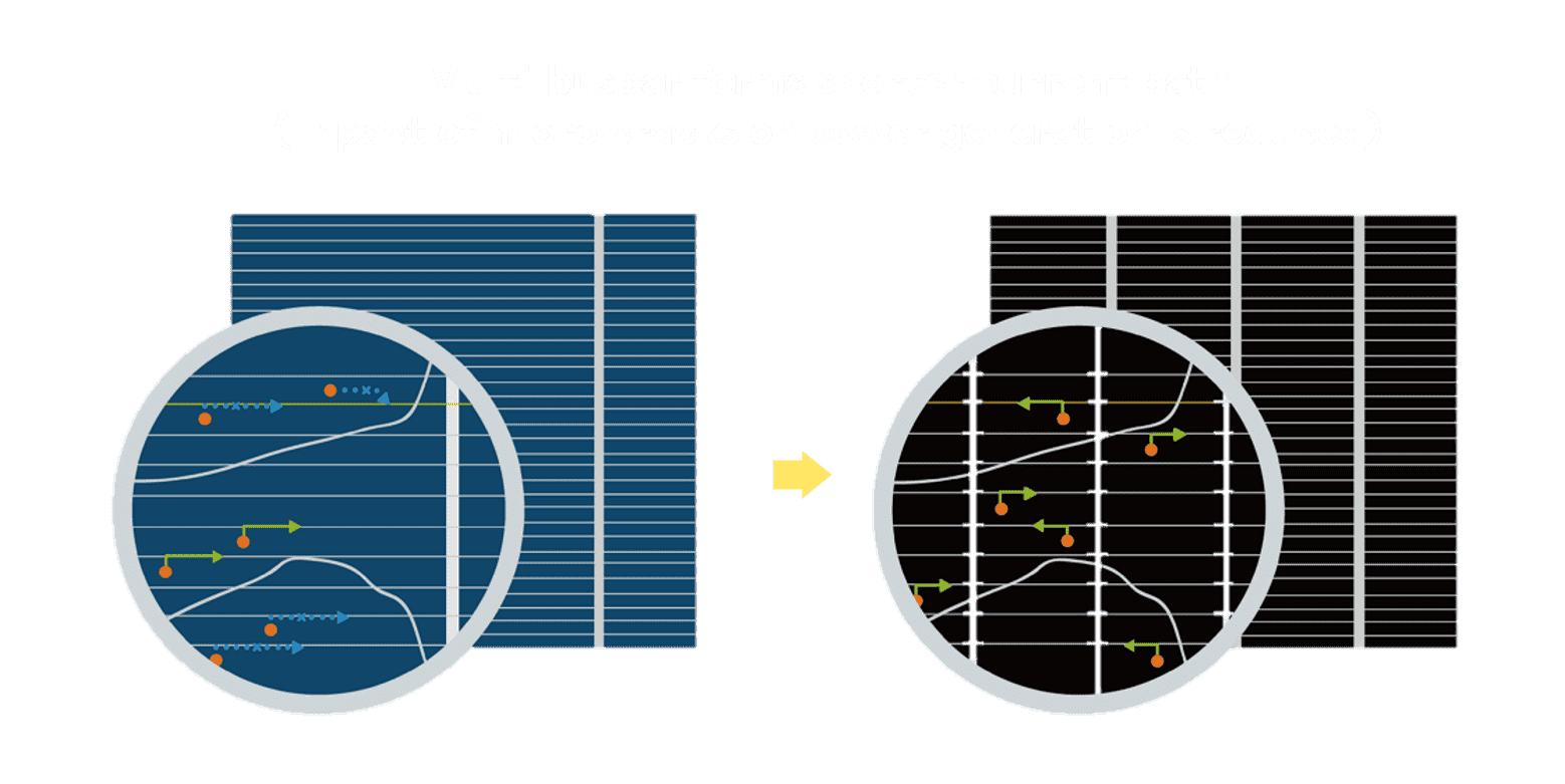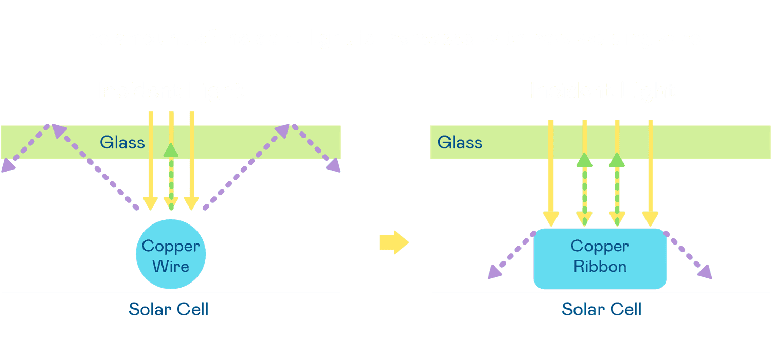 - 电池使用多条铜导线 (Copper wire) 于电池片上形成较短的电流路径,,提高电流收集效率,,,,采用圆形设计的铜导线较传统扁平式的铜焊带 (Ribbon),,,,可增加入射至电池的光线量。。。。