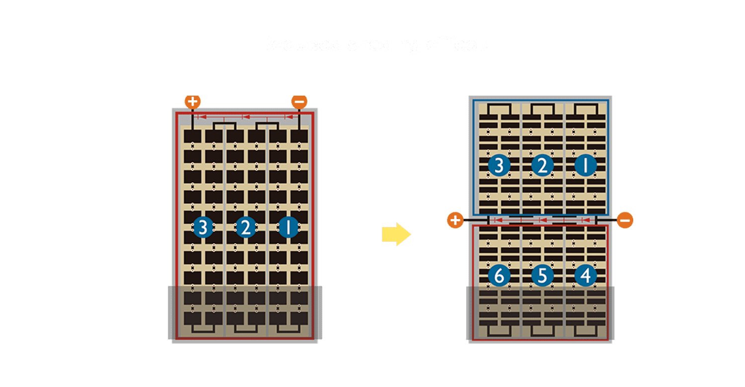 - 结合半切电池,,,,降低遮阴影响、、、提升模组抗隐裂能力、、并减少电阻损耗,,进一步提升模组发电效能。。。。